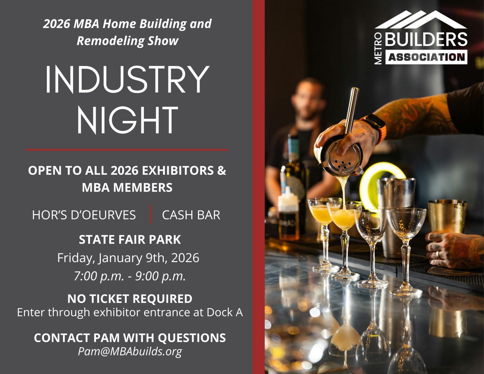 Join MBA members and vendors for an exclusive party on Friday night! This event is open to all exhibitors and doesn't require registration. Enjoy light snacks, a cash bar, and entertainment as we come together to celebrate a successful start to the Home Show. Don’t miss the fun!